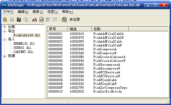4. FishCabLibU.dll,它是一個(gè)包裝層,用于封裝Windows的FCI/FDI接口,因?yàn)檫@二個(gè)接口是基于C的,且接口較為復(fù)雜,我也只好用C來(lái)封裝了,并以標(biāo)準(zhǔn)的導(dǎo)出函數(shù)提供給其它編程語(yǔ)言調(diào)用。導(dǎo)出的API函數(shù)如下圖: