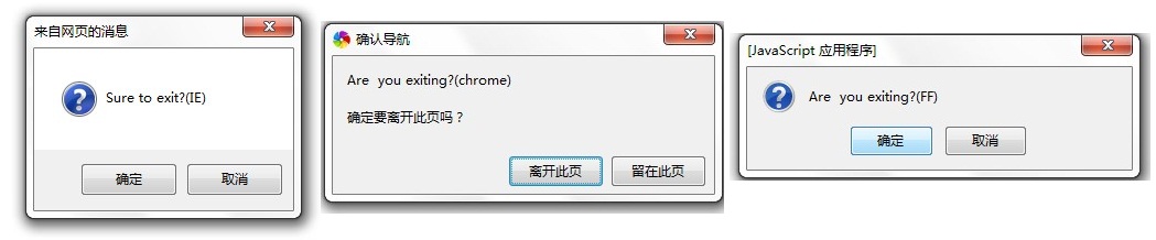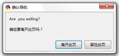 所以如果我們想要讓它的確認(rèn)框出現(xiàn)我們自己的東西,我嘗試了許多次,發(fā)現(xiàn)FF無法做到用別的對話框代替它的默認(rèn)框,所以我們只能默默的添加一個confirm,但是這樣的話FF會有兩次提示。IE和chrome都會在離開提示里輸入函數(shù)的返回字符串,這一點(diǎn)還是不錯的,以下是經(jīng)過一樓的反饋后修改過的代碼。