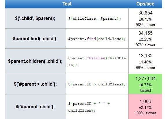在其所給的測試用例中 確實(shí)是使用jquery的find方法最快,但是稍作修改卻得到了另外的一個(gè)結(jié)果$('#parent > .child')完勝。