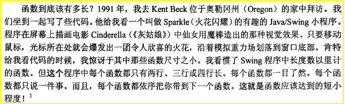 1、短函數(shù):代碼閱讀費(fèi)點(diǎn)力氣,因?yàn)槲覀儽仨毥?jīng)常轉(zhuǎn)換上下文去看看子程序做了什么。但是讓small method容易理解的真正關(guān)鍵在于一個(gè)好的名字。讀者可以通過(guò)名字了解函數(shù)的作用,根本不必去看其中寫(xiě)了些什么?!缙诘木幊陶Z(yǔ)言中,調(diào)用方法需要額外開(kāi)銷,這使得coder不愿意使用small method。但是現(xiàn)代的OO語(yǔ)言幾乎已經(jīng)完全免除了process內(nèi)的額外開(kāi)銷(函數(shù)調(diào)用)。