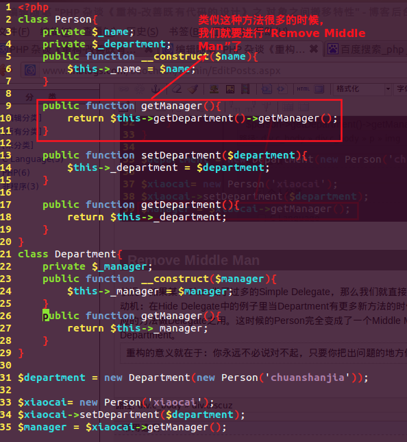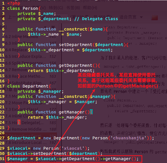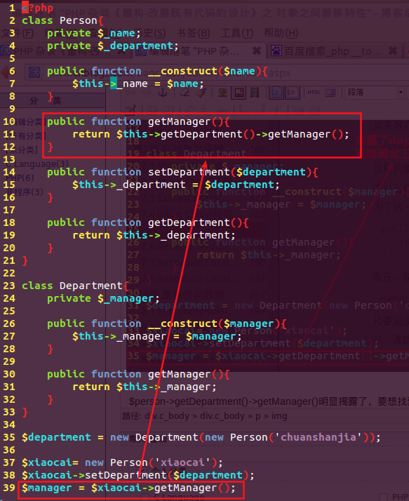 $person->getDepartment()->getManager()明顯揭露了,要想找到Xiaocai的領(lǐng)導,必須要經(jīng)過department,所以我們要做的事隱藏department?!梢詼p少耦合性。