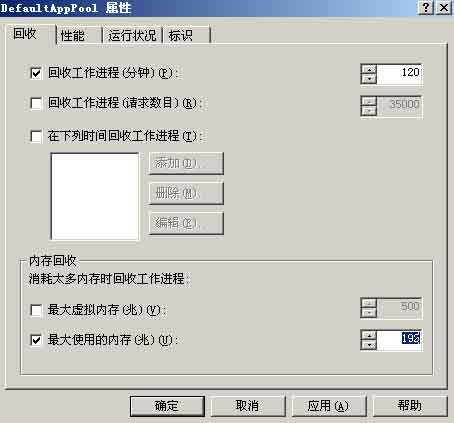 用鼠標展開本地計算機下面的“應用程序池”選項,然后右擊該選項下面的“DefaultAppPool”,再執(zhí)行右鍵菜單中的“屬性”命令,在其后彈出的屬性設置界面中,單擊“回收”標簽,進入到如圖1所示的標簽頁面。選中該頁面中的“回收工作進程(分鐘)”選項,同時在該選項右側(cè)的文本框中輸入合適的數(shù)值,來指定多長時間不活動的工作進程可以被IIS6.0自動回收;