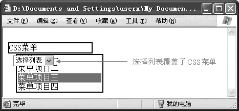 在最新的IE瀏覽器(6.0)中,IFRAME元素和所有表單元素根據(jù)z-index屬性值或它們在HTML頁面中出現(xiàn)的次序來確定顯示優(yōu)先次序,但SELECT元素除外。