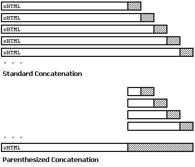 乍一看,可能很難發(fā)現(xiàn)這段代碼與上一個代碼示例的差別。其實,此代碼只是在 sHTML = sHTML & 后的內(nèi)容外面加上了括號。這實際上是通過更改優(yōu)先順序,來減小大多數(shù)字符串連接操作中處理的字符串大小。在最初的代碼示例中,ASP 編譯器將查看等號右邊的表達式,并從左到右進行計算。結(jié)果,每次重復都要進行 16 個連接操作,這些操作針對不斷增長的 sHTML 進行。在新版本中,我們提示編譯器更改操作順序?,F(xiàn)在,它將按從左到右、從括號內(nèi)到括號外的順序計算表達式。此技術(shù)使得每次重復包括 15 個連接操作,這些操作針對的是不會增長的較小字符串,只有一個是針對不斷增長的大的 sHTML。圖 1 顯示了這種優(yōu)化方法與標準連接方法在內(nèi)存使用模式方面的比較。