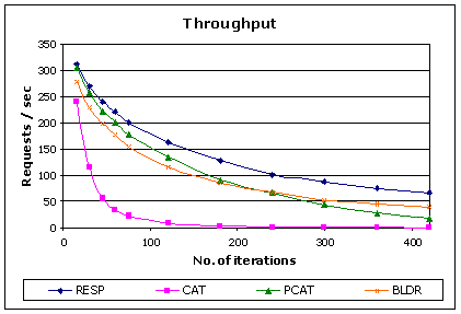 下面的一系列圖表顯示了各種方法對整個應用程序吞吐量的影響,以及 ASP 頁面的響應時間。通過這些圖表,我們可以了解應用程序支持的請求數(shù)目,以及用戶等待頁面下載至瀏覽器所需的時間。