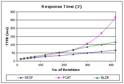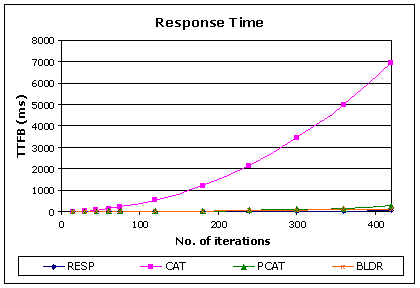 圖 3 和圖 4 中的圖表顯示了按“到第一字節(jié)的時間”測量的響應時間(以毫秒為單位)。因為標準字符串連接方法 (CAT) 的響應時間增加過快,所以又提供了未包括此方法的圖表(圖 4),以便分析其他方法之間的差異。有一點值得注意,多重 Response.Write 方法 (RESP) 和 StringBuilder 方法 (BLDR) 隨重復次數(shù)的增加呈現(xiàn)一種近似線性的增長,而標準連接方法 (CAT) 和加括號的方法 (PCAT) 則在超過一定的閾值之后開始迅速增加。