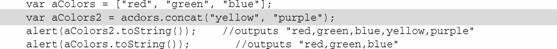 在這個例子中,用concat()方法把字符串"yellow"和"purple"加到數(shù)組中。數(shù)組aColors2包括5個值,而原始數(shù)組aColors仍只有3個值??赏ㄟ^對兩個數(shù)組分別調(diào)用toString()方法證明這一點。