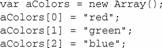 此外,如果知道數(shù)組應(yīng)該存放的值,還可用參數(shù)聲明這些值,創(chuàng)建大小與參數(shù)個數(shù)相等的Array對象。例如,下面的代碼將創(chuàng)建一個有三個字符串的數(shù)組: