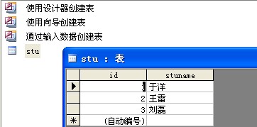 1. 在站點(我的站點為:E:\javatest)下建立文件夾“AccessDb”并在文件夾下建立數(shù)據(jù)庫“test.mdb”以及表“stu”,stu字段為 id,stuname test.mdb所在路徑為:E:\javatest\AccessDb 下面