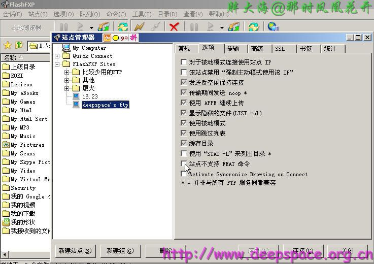 點"站點"--"站點管理器" 或者直接按快捷鍵"F4",然后選擇你要改變的站點設置,點"選項",把"站點不支持FEAT命令"前面的鉤去掉。確定退出。