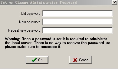 然后會出現(xiàn)如圖7的界面。因為是第一次使用,所以是沒有密碼的,也就是說原來的密碼為空。不用在 old password里輸入字符,直接在下面的New password和Repeat new password里輸入同樣的密碼再點OK就可以了。這里建議設(shè)置一個足夠復雜的密碼,以防止別人暴力破解。自己記不得也沒有關(guān)系,只要把 ServUDaemon.ini里的LocalSetupPassword=這一行清除并保存,再次運行ServUAdmin.exe就不會提示你輸入密碼登錄了。