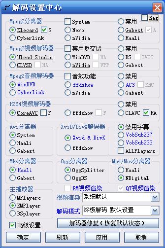 g. Ulead/Moonlight視頻解碼器切換,Gabest分離器、CoreAVC解碼器、nVidia解碼器不同版本的切換,可在“解碼設(shè)置中心”中通過鼠標雙擊直接進行。