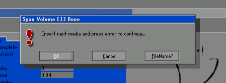 在快要結(jié)束的時候也會出現(xiàn)一個類似的窗口,要求用戶重新插入第1卷鏡像文件存儲介質(zhì),此處也有3個選項(xiàng),“OK”、“Cancel”和“FileName?”。這是由于Ghost將硬盤的分區(qū)信息存儲在了第一卷鏡像文件的起始部分,而在備份進(jìn)程結(jié)束時,還要對此信息進(jìn)行更新,所以要求用戶重新插入第一卷鏡像文件的存儲介質(zhì)。如果你始終采用同一存儲介質(zhì)存放鏡像文件,在此直接點(diǎn)擊“OK”即可。至此,你也就完成了系統(tǒng)的分卷壓縮備份工作。