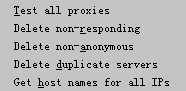 此菜單包含對整個代理列表的操作,如圖。選擇相應(yīng)命令,可對所有代理進(jìn)行檢測,可一次性刪除全部代理或刪除所有不可用代理等。