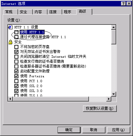2、在IE中選取 工具| Internet 選項(xiàng)...|高級,不選"使用HTTP 1.1" 和 "通過代理連接使用HTTP 1.1"兩項(xiàng)。