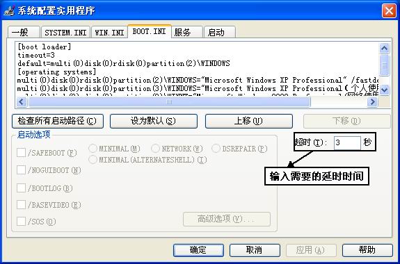 延遲時間是系統(tǒng)啟動引導(dǎo)菜單后在設(shè)定的延遲時間內(nèi)用戶沒有進行任何操作時,進入默認的操作系統(tǒng)。系統(tǒng)默認的延遲時間為 30 秒。如果感覺默認的延遲時間過長,可以輸入自己需要的延時時間,如 10 秒。設(shè)置時,首先打開 Boot.ini 文件(注意要去掉該文件的隱藏、只讀屬性),隨后在 [boot loader] 字段下找到“ timeout =”語句,將其中的 30 ,改為 10 即可。我們還可以在“系統(tǒng)配置實用程序”中對其進行修改。在“開始 / 運行”中鍵入“ Msconfig ”命令,在彈出的“系統(tǒng)配置實用程序”中單擊“ Boot.ini ”標簽(如圖 2 ),在“ Boot.ini ”界面中的“超時 XX 秒”項中輸入需要的延時時間即可。