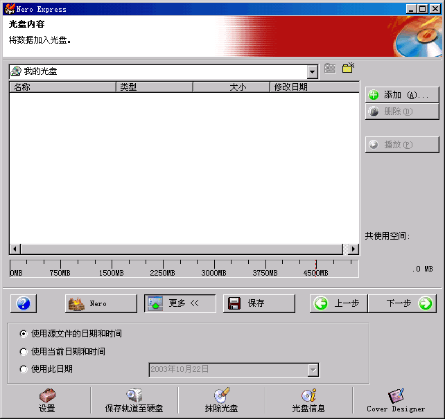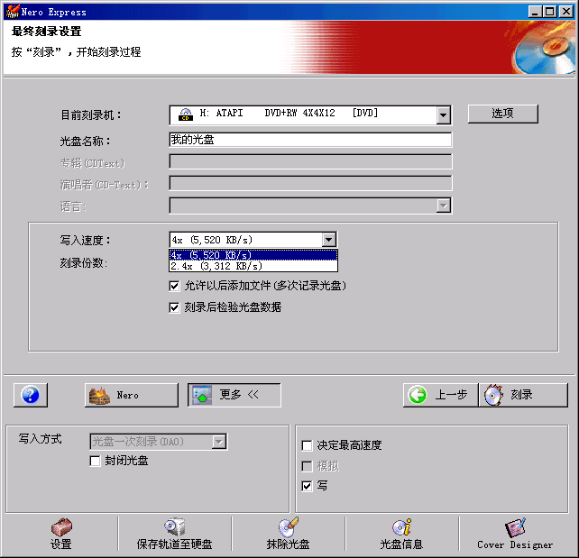 這里可以更改你光盤的名字,刻錄的速度(我們就選最高速4X,每秒5.52M啊,快!),如果一次可以刻滿就把以后添加文件勾掉,如果希望節(jié)省時(shí)間,把檢驗(yàn)數(shù)據(jù)也勾掉。更多下可以選擇是否封閉光盤(如果封閉可以節(jié)省一部分空間,但以后不能續(xù)刻了)。