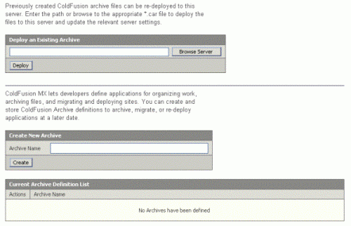 Archives and Deployment則是涉及到了高端的應用,比如配置用戶自己的文件,交由服務器管理,那么可以管理的文件以.car的方式存儲在機器中,通過browse server來導入,那么可供管理的文檔中包含哪些信息呢?包括:文件名和路徑,數據源設定,Verity全文檢索索引等等。管理界面如下圖: