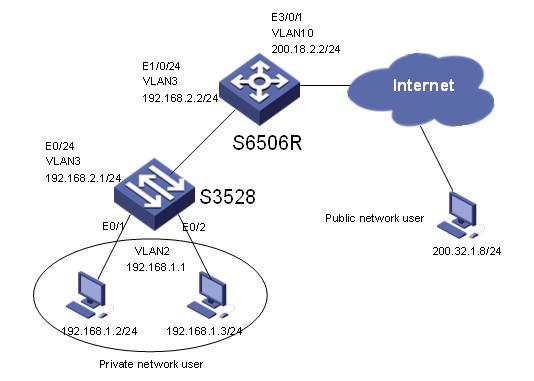 1) 某公司的一個內(nèi)部網(wǎng)絡(luò)在Quidway S3528的連接下,要求通過Quidway S6506R的地址轉(zhuǎn)換功能連接到廣域網(wǎng),訪問Internet;