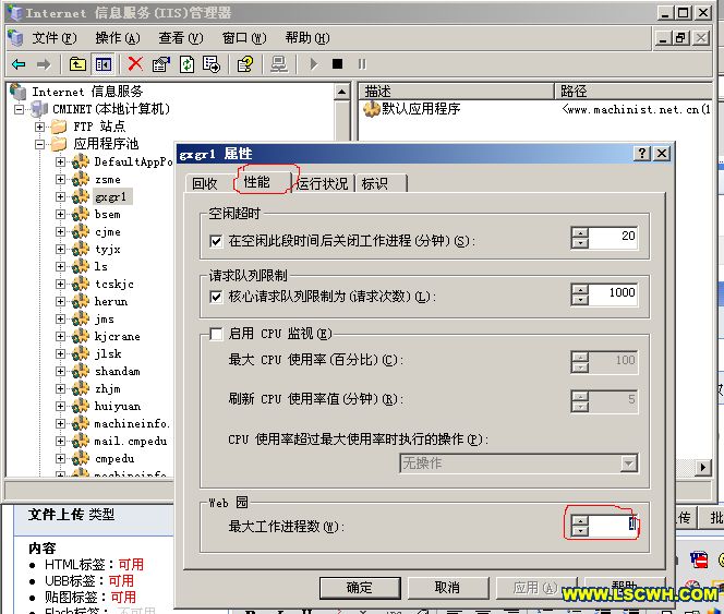 設(shè)置Internet信息服務(wù)(IIS)管理器中的應(yīng)用程序池,更改網(wǎng)站的程序池屬性見下圖: