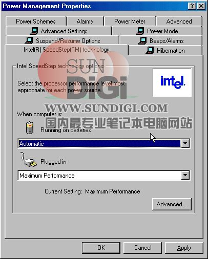 如果使用的是Windows 98/Me/2000操作系統(tǒng),可以到Intel網(wǎng)站下載并安裝SpeedStep程序,在程序界面中可以對CPU的時鐘頻率進行定義,用戶可以根據(jù)使用需要自行指定CPU運行的頻率檔次。諸如IBM,SONY等品牌筆記本電腦的電源管理程序也提供了類似的功能,雖然同樣也是基于Intel SpeedStep,但是要細致得多,提供了非常豐富的節(jié)能模式主題以滿足不同的使用需求。雖然Windows XP中已經(jīng)內(nèi)嵌了該程序,但是遺憾的是,它并沒有提供對該程序的手動定義,系統(tǒng)安裝結(jié)束后會自動默認將電源管理方案調(diào)整為筆記本電腦節(jié)能方案,這也是為什么很多用戶感覺到安裝Windows XP系統(tǒng)后電腦變慢的一個原因之一。