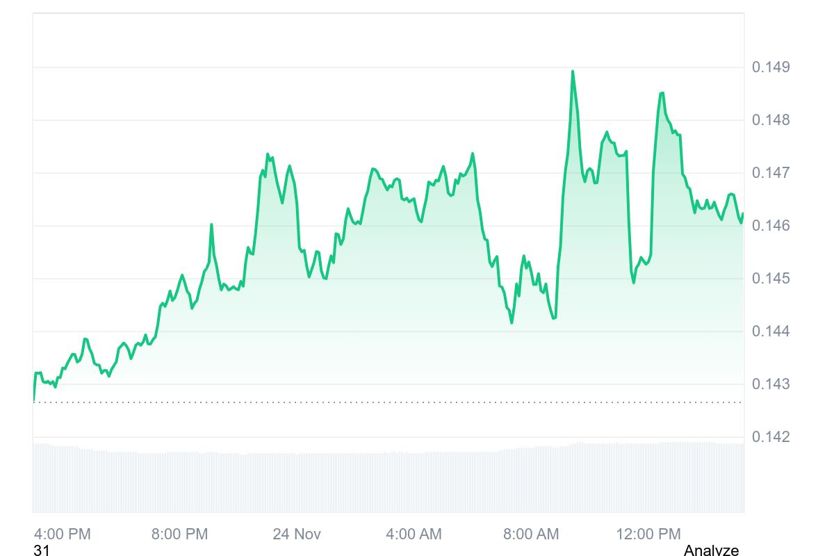 在 GDOG ETF 上線前,狗狗幣價格迅速做出反應(yīng)。在 ETF 開始交易前的幾個小時內(nèi),DOGE 價格攀升至 0.145 美元左右,當(dāng)日漲幅約為 3%。雖然漲幅絕對值不大,但在比特幣和以太坊價格相對平穩(wěn)的大盤中,DOGE 的上漲顯得尤為突出。此次上漲反映出交易員們?nèi)找嬖鲩L的預(yù)期,即現(xiàn)貨 ETF 可以吸引新的資金流入,并驗證狗狗幣作為一種合法投資資產(chǎn)的價值。