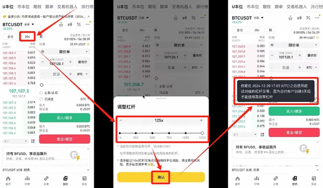 開通成功后,我們點(diǎn)擊一下杠桿倍數(shù)這里,幣安的合約杠桿最大可以開到125倍。但是當(dāng)你點(diǎn)擊確認(rèn)的時(shí)候,會(huì)發(fā)現(xiàn)提交不了。它會(huì)提示新創(chuàng)建的合約賬戶,要等3太難之后才能使用高倍杠桿。所以想做高倍合約的話,盡早把賬戶開起來總是沒錯(cuò)的。