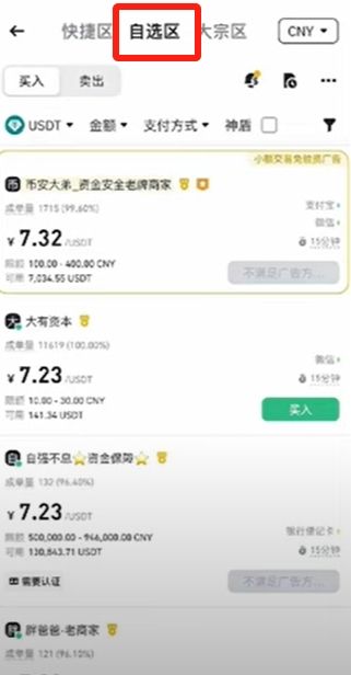 進(jìn)來之后上面分為三個(gè)區(qū),快捷區(qū)、自選區(qū)和大宗區(qū)。快捷區(qū)就是平臺(tái)會(huì)自動(dòng)給你匹配一個(gè)賣家,好處是快,缺陷是各方面條件可能并不是你最想要的。