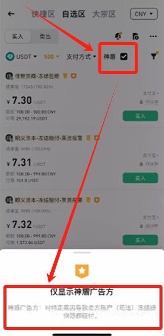 再來看看后面的神盾。它的意思就是賣家在賣幣的時(shí)候,如果因?yàn)槭盏搅速I家的錢,而導(dǎo)致收款賬戶被凍結(jié),那么賣家將會(huì)獲得該筆訂單金額10%的賠付。所以神盾主要是保護(hù)賣家的。我們現(xiàn)在是買幣,作為買方,這個(gè)夠不夠選其實(shí)沒有太大關(guān)系。對(duì)于新注冊的賬戶來說,本來能交易的選擇就不多,勾選了這個(gè)的話,可能就更沒幾個(gè)了,所以就先不勾選了。