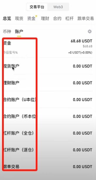 然后把頁面往上滑,可以看到這里有很多個(gè)賬戶。有資金賬戶、現(xiàn)貨賬戶、理財(cái)賬戶、合約賬戶等等。因?yàn)閹虐彩菍魧S?,我們C2C買的U,默認(rèn)都是放在資金賬戶,現(xiàn)貨會(huì)放在現(xiàn)貨賬戶,理財(cái)會(huì)放在理財(cái)賬戶,合約也有專門的合約賬戶。各個(gè)賬戶之間是可以隨意劃轉(zhuǎn)的,秒到且沒有任何手續(xù)費(fèi)。