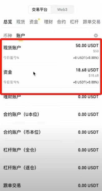 再回到這里可以看到現(xiàn)貨賬戶里有了50U,資金賬戶里剩下18.68U,這就是賬戶之間的劃轉(zhuǎn),非常簡單,其他賬戶也是同理。