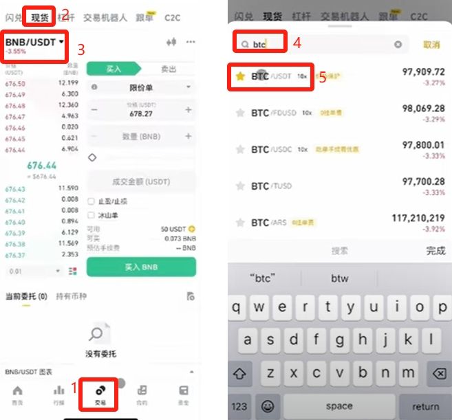 我們現(xiàn)在要去購買比特幣現(xiàn)貨,購買現(xiàn)貨的話需要現(xiàn)貨賬戶里有錢,現(xiàn)在是有的。底部切換到【交易】,上面選擇【現(xiàn)貨】,點(diǎn)擊左上角的幣對(duì),在搜索框中輸入“BTC”,選擇第一個(gè)“BTC/USDT”,意思是用USDT來交易比特幣。