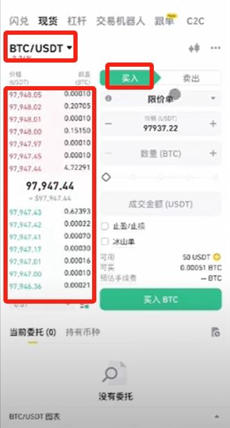 現(xiàn)在幣對(duì)這就切換成比特幣了,這里有買入和賣出兩個(gè)選項(xiàng),我們現(xiàn)在是買,所以切換到【買入】,上面紅色的是賣方報(bào)價(jià),下面綠色的是買方報(bào)價(jià),中間這個(gè)大的數(shù)字就是比特幣當(dāng)前的價(jià)格。