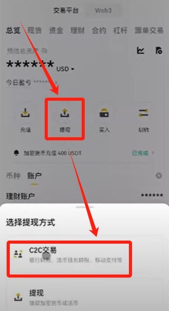 當(dāng)我們在交易所賺了錢,需要把USDT賣掉換成人民幣的時(shí)候,需要先把USDT轉(zhuǎn)到資金賬戶。在總覽下面點(diǎn)擊【提現(xiàn)】,選擇【C2C交易】。