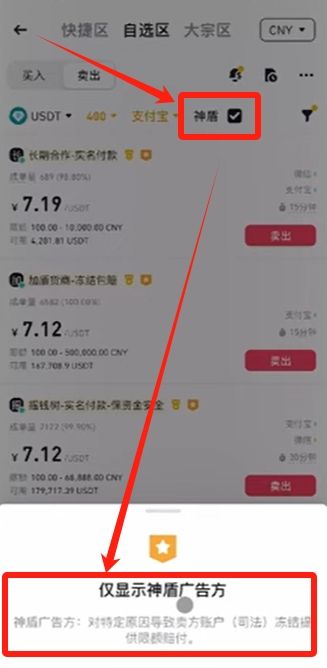 我們現(xiàn)在是賣U,所以一定要勾選上神盾。之前說了神盾是對(duì)賣方的一種保護(hù),賣方在賣幣的時(shí)候如果因?yàn)槭樟速I家的錢,而導(dǎo)致收款賬戶被凍結(jié),那么賣方將會(huì)獲得該筆訂單金額10%的賠付。有神盾標(biāo)識(shí)的賣家都會(huì)有一筆保證金壓在平臺(tái),這筆賠付就是從買方的保證金中扣除。雖然每筆訂單的賠付有上限是2000U,但這個(gè)終歸增加了買房的作惡成本,可以幫我們過濾掉一部分黑資,所以賣U的時(shí)候,這個(gè)神盾一定要勾選上。
