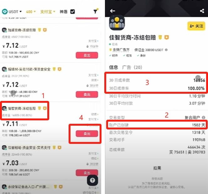 賣U的時(shí)候這個(gè)頁面默認(rèn)是按價(jià)格從高到低排列的,跟買U的時(shí)候是相反的。作為賣方我們肯定是希望價(jià)格越高越好,所以我們也是從上往下看就好。找到一個(gè)價(jià)格盡量高,成單率和成單量也盡量高的買家。當(dāng)找到一個(gè)覺得還不錯(cuò)的,就點(diǎn)擊他的頭像,進(jìn)到他的主頁,看看他賬號(hào)的創(chuàng)建時(shí)間,這一家有4年多了就還可以,他的成單率和成單量也還不錯(cuò)。點(diǎn)擊他后面的【賣出】按鈕。