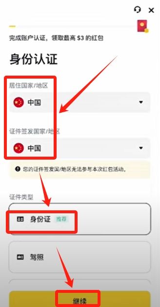 選擇你的居住國家和證件簽發(fā)國家,證件類型身份證、駕照、護(hù)照都可以。這里就選擇身份證,點(diǎn)擊【繼續(xù)】。