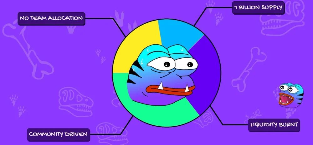 這個吉祥物展現(xiàn)出一個表情豐富的卡通恐龍表情包,象征著這個代幣輕松愉快的特性。這個項目圍繞著社群氛圍、幽默感,以及成為Solana上快速增長的表情包潮流的一部分。