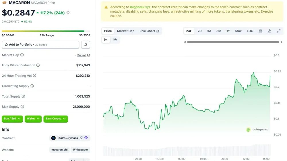 今天的反彈同時伴隨著穩(wěn)健的24小時交易量為292,310美元,反映出市場關注度的上升。這一劇烈回升顯示出交易者正在積極累積MACARON,因為挖礦熱潮回歸。