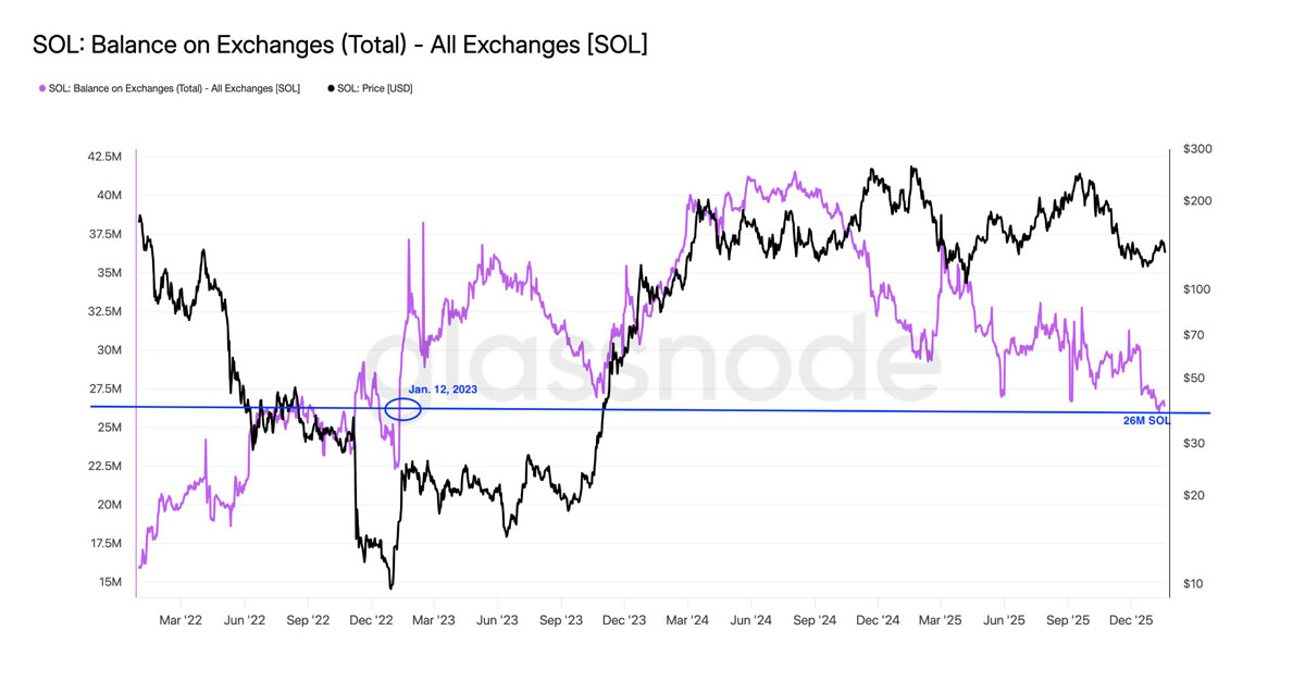 Glassnode的數(shù)據(jù)顯示,自2025年11月末以來,交易所上的SOL供應(yīng)量大幅減少。下圖顯示,交易所上的SOL余額于周三減少了500萬枚至26,058,693枚,達(dá)到自2023年1月12日以來的最低水平。