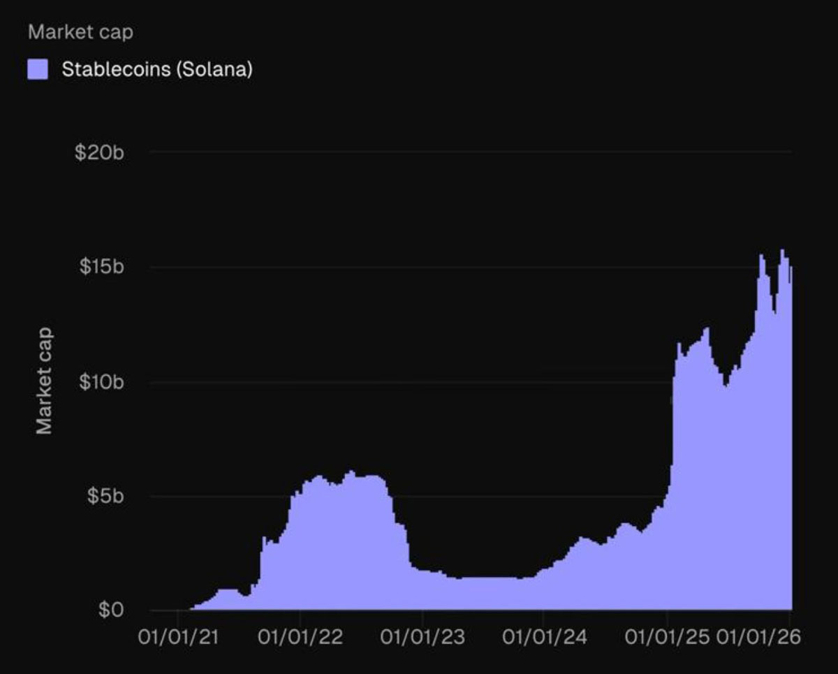根據(jù)Token Terminal的數(shù)據(jù),Solana的穩(wěn)定幣供應(yīng)量在過去七天內(nèi)飆升超過15%,達(dá)到150億美元的歷史新高。
