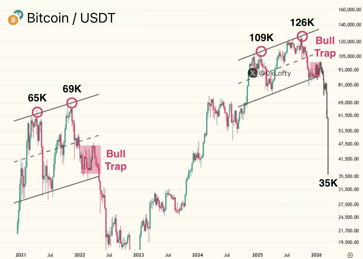 例如,分析師洛夫蒂表示,比特幣價(jià)格可能在2月跌至35,000美元,他指出這是個(gè)“完美的多頭陷阱”,原因是比特幣未能守住其上升通道的上軌,如下所示。