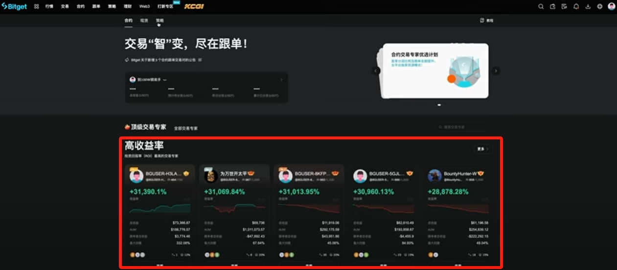接下來(lái)就是跟單的功能。跟單可以選擇現(xiàn)貨跟單、合約跟單或者策略跟單。跟單可以理解成我們?nèi)ジ骋粋€(gè)交易員,可以把他們看做一個(gè)基金經(jīng)理,他們會(huì)在這里去帶單。