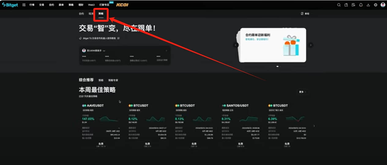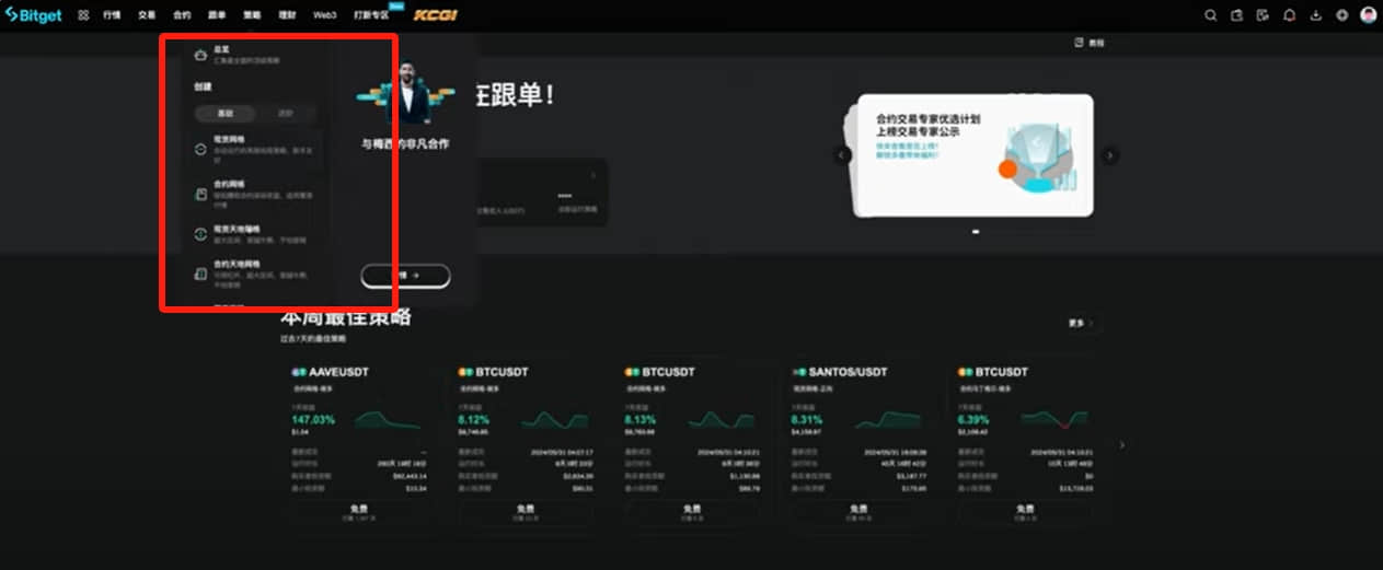 這邊有現(xiàn)貨網(wǎng)格、合約網(wǎng)格、我們可以去創(chuàng)建策略。如果想風(fēng)險(xiǎn)低一些的話(huà),我們就選擇現(xiàn)貨的網(wǎng)格、現(xiàn)貨天地網(wǎng)格、現(xiàn)貨定投這幾個(gè)菜單,還有就是屯幣寶,這幾個(gè)菜單我們就是玩現(xiàn)貨的網(wǎng)格,如果能夠接受稍微高一點(diǎn)的風(fēng)險(xiǎn),并且想博一下收益的話(huà),我們就去選擇合約的網(wǎng)格,或者下面一些進(jìn)階的策略、合約CTA或者合約量化。