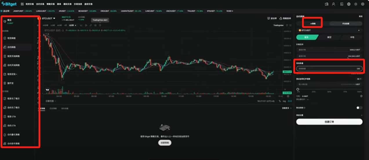 我們都調(diào)整好之后,這里就會(huì)提示你要輸入多少的保證金,才能去開(kāi)啟這個(gè)策略。因?yàn)槟愕谋WC金是按照你的價(jià)格區(qū)間范圍來(lái)調(diào)整的,如果說(shuō)太大的話(huà), 我們可以把它的區(qū)間給改小一點(diǎn)。改小之后我們這邊投入的本金就會(huì)少一些了。下面的“移動(dòng)網(wǎng)格”我是不建議大家去開(kāi)啟的,因?yàn)樗@個(gè)玩?zhèn)€雖然能移動(dòng)上去,但是他不會(huì)自動(dòng)移下來(lái)的。這也是沒(méi)有辦法,因?yàn)檫@個(gè)策略只能這樣跑。我是建議大家不要開(kāi)移動(dòng)網(wǎng)格,就直接按照自己設(shè)置好的區(qū)間跑就可以了。如果是出區(qū)間的話(huà),我們?cè)偃リP(guān)閉一下我們的策略,都選擇好之后,我們?cè)龠x擇【創(chuàng)建訂單】。這樣策略就完成了,其他的策略也是類(lèi)似的。
