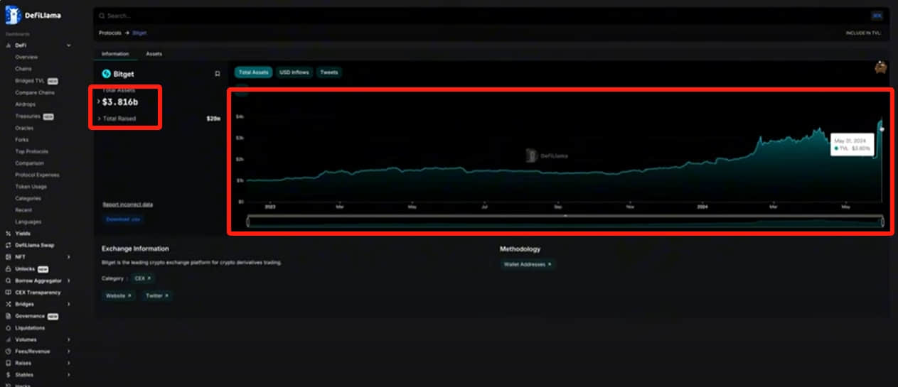鏈上的數(shù)據(jù)也是公開(kāi)的,能看的到的。我們也可以在defiliflama里面,CEX頁(yè)面里面我們可以看到他們的儲(chǔ)備金,是有達(dá)到了30億個(gè),就是30億美金的資產(chǎn)證明。而且我們可以看到他這里在交易所里面的資金曲線(xiàn),也都是在穩(wěn)健的上漲的。從2022年的9個(gè)億,到現(xiàn)在有將近40億美金的一個(gè)資產(chǎn)了。