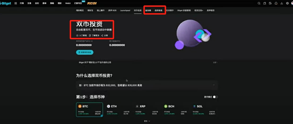 或者是雙幣投資,雙幣投資它是博一個(gè)買(mǎi)賣(mài)方向,是結(jié)合期權(quán)的一些策略去操作的。這里也會(huì)有不同的年化,會(huì)在這邊顯示出來(lái)。還有些鯊魚(yú)鰭、趨勢(shì)智贏(yíng)這些,具體就不詳細(xì)介紹了。
