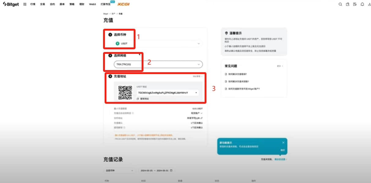 充值我們?cè)谶@里選擇幣種USDT,選擇一下網(wǎng)絡(luò),在復(fù)制一下地址。我們只需要把錢(qián)包或者其他像OKX、幣安里面的USDT,轉(zhuǎn)到這個(gè)地址里面就可以了。