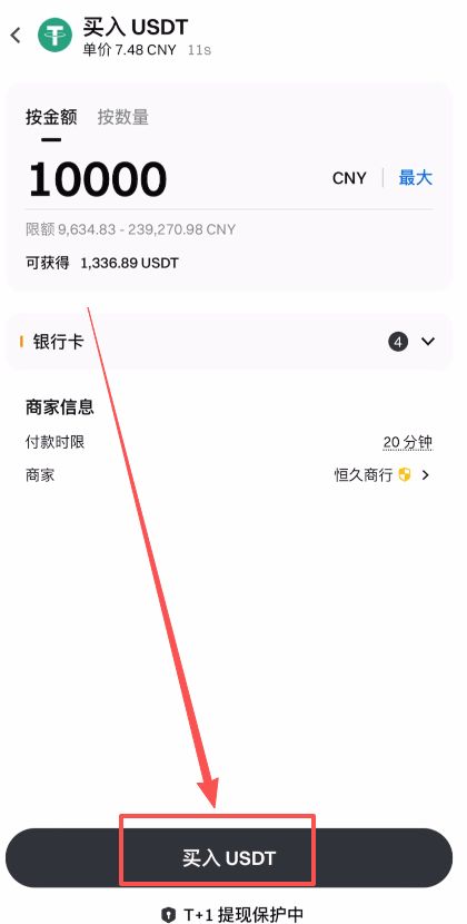 在這里輸入進(jìn)我們要購買的金額或者是USDT的數(shù)量,比如說我這里想購買1000人民幣的,然后點(diǎn)擊下方的“選擇支付方式”,我們就可以選擇“銀行卡”。
