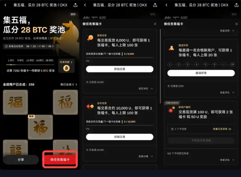 今年OKX(官方注冊(cè) app下載)安排上了幣圈的「集五福」活動(dòng),跟著 OKX 一起集齊五福福卡,合成「財(cái)神福」解鎖 28 個(gè) BTC 的超大獎(jiǎng)池!
